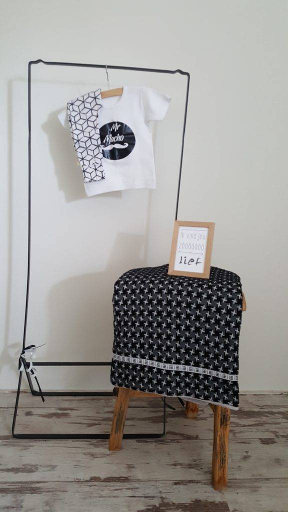 Het mooie zwart/wit, geblokte dekentje is gemaakt door Zoofs. De rieten stoel is van een oude tante van mijn moeder. Het zwarte kledingrekje is van Mijn Hus, “ook een leuke lifestyle winkel op Urk.”
