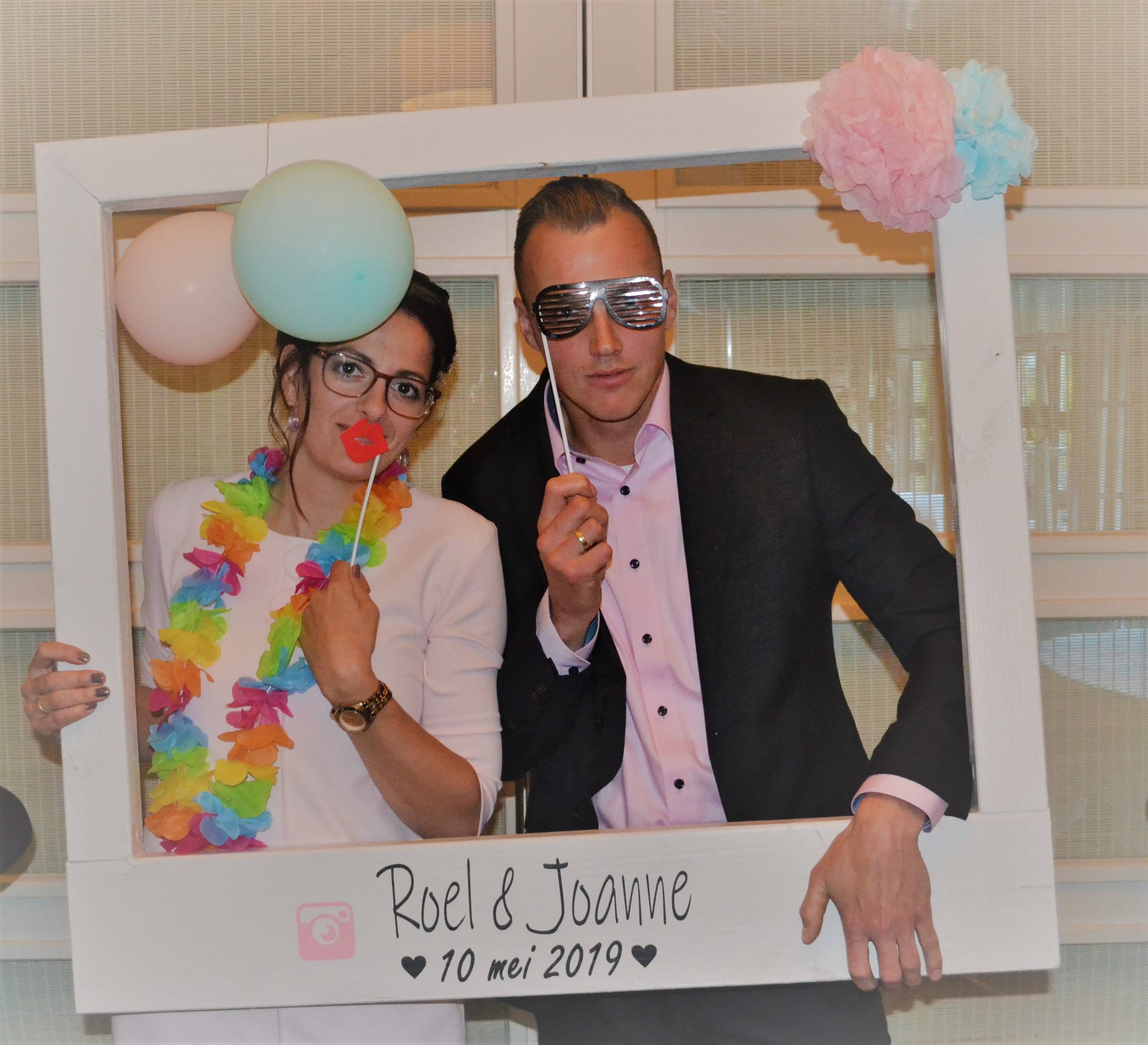 Toen ik op internet ging zoeken naar een fotoframe, schrok ik best van de prijzen. Daarom schakelde ik een handige zwager in die voor mij een frame van hout maakte. Ik maakte met mijn cameo silhouette (plotter machine) een mooie sticker en met een paar ballonnen en servet bloemen, zag het er super leuk uit! Terwijl de gasten binnenkwamen om te feliciteren, nam ik ze eerst op de foto 😉 De foto’s zette ik later weer in de weddingapp, zodat de gasten deze ook weer terug konden zien.
